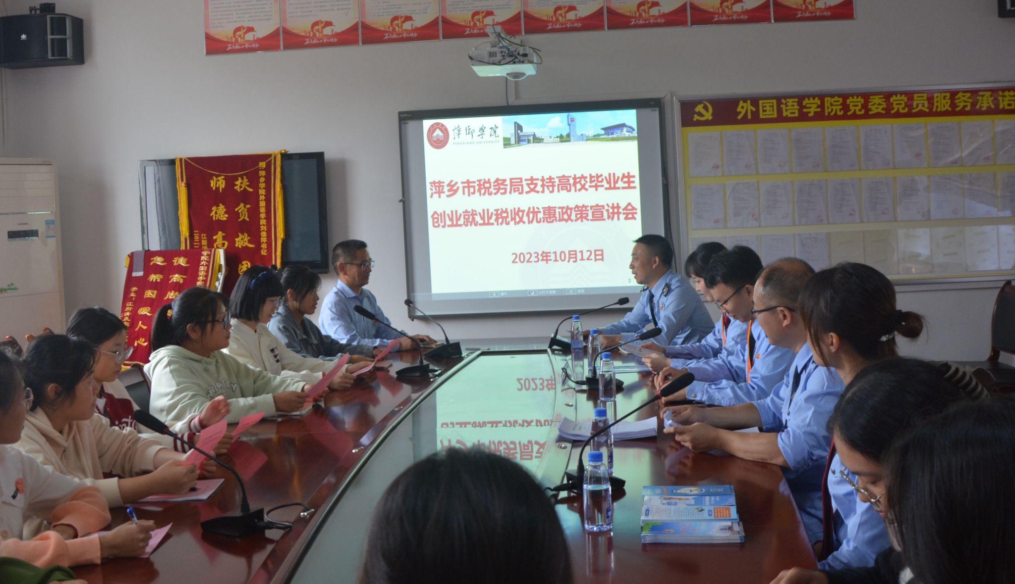 10月12日,萍乡市税务局走进外国语学院学院,开展了“萍乡市税务局支持高校毕业生创业就业税收优惠政策宣讲会”活动。活动现场,宣讲人员结合案例,就大学生创业就业关注度较高的问题,深入浅出地讲解了高校毕业生创业就业有关税收优惠和常见普惠性税收优惠政策,“一对一”解答毕业生创业涉税困惑,并现场发放了“支持高校毕业生创业就业税费优惠政策”宣传资料。