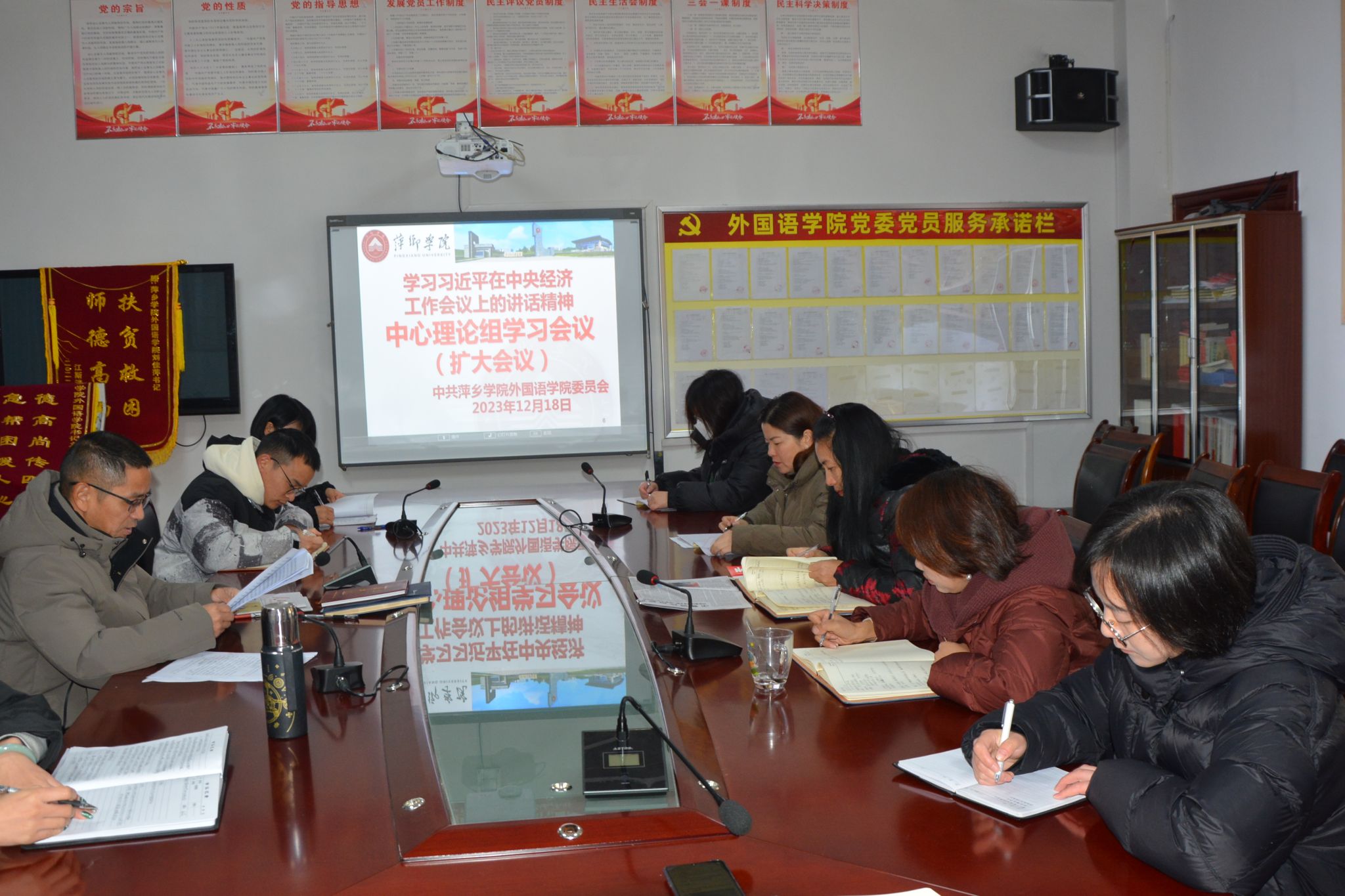 12月18日上午午,外国语学院党委理论学习中心组召开党委中心组理论学习(扩大)会议,学习贯彻“习近平在中央经济工作会议上的讲话”精神。外国语学院党委理论中心组成员,科级以上干部和辅导员参加了此次学习会。马克思主义学院老师受邀列席旁听指导,学习会由党委书记刘佳萍主持。