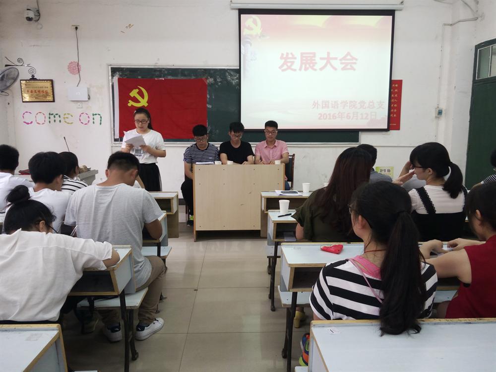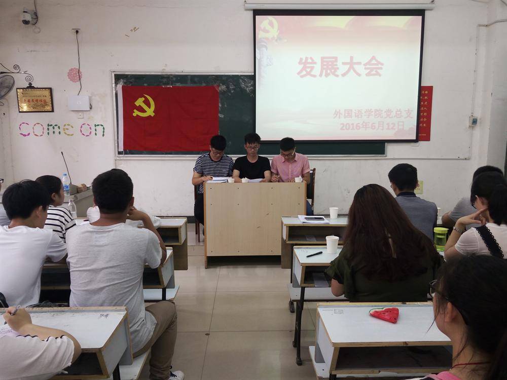2016年6月12日中午12时40分,外国语学院党总支在英华楼3304教室召开发展大会。会议由正式党员李世昌、杨敏杰、章志定主持。本次大会应到党员54名,包括正式党员29名,预备党员25名,因事因病请假的党员有15名,实际到会党员39名。其中,到会有表决权的党员18名。