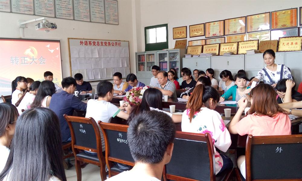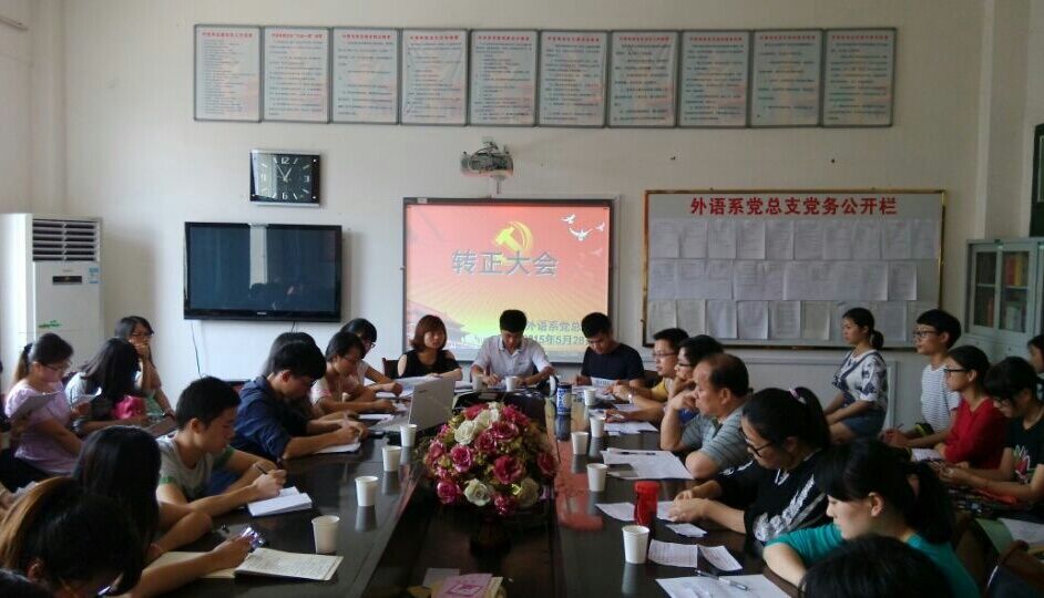 外语系党总支于2015年5月28日在英华楼3319会议室召开预备党员转正大会。党总支书记黄柏萍、党总支副书记刘佳萍、党总支组织员魏峰、党总支组织委员江双莲、党总支宣传委员张建明、学生党支部书记彭侃、所有在校党员、预备党员及学生党支部全体成员共68人出席此次会议。会议由学生党员江根伟、胡敏和冯志勇主持。