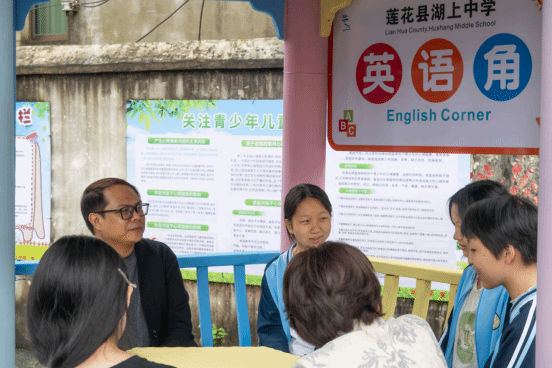 活动最后,外国语学院师生与湖上中学学生共同开展了一场英语角活动。外教Joey、学生志愿者与乡村孩子们围坐成圈,围绕“我的家乡”“我的梦想”等话题自由交流。欧阳院长也走进英语角,称赞孩子们“眼里有光、心中有爱、口中有故事”。原本羞涩的学生在鼓励中勇敢开口,用英语介绍自己的梦想与家乡莲花故事,真诚而温暖的对话将此次送教推向了更深的情感共鸣。