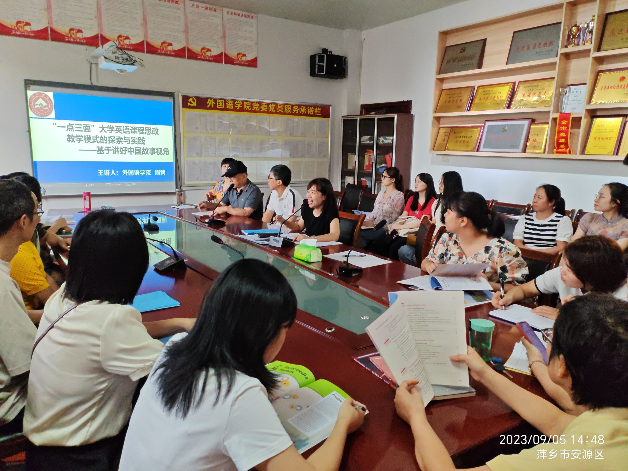 为了促进教学交流,加强教改探索,9月5日下午,外国语学院在英华楼3319会议室举办了教学经验分享会,此次分享会由萍乡学院教学能手、英语教研室主任周利老师主讲,她分享的主题是:“一点三面”大学英语课程思政教学模式的探索与实践——基于讲好中国故事视角。本次分享会由本科大学英语教研室主任李婕老师主持,学院全体教师参加此次活动。