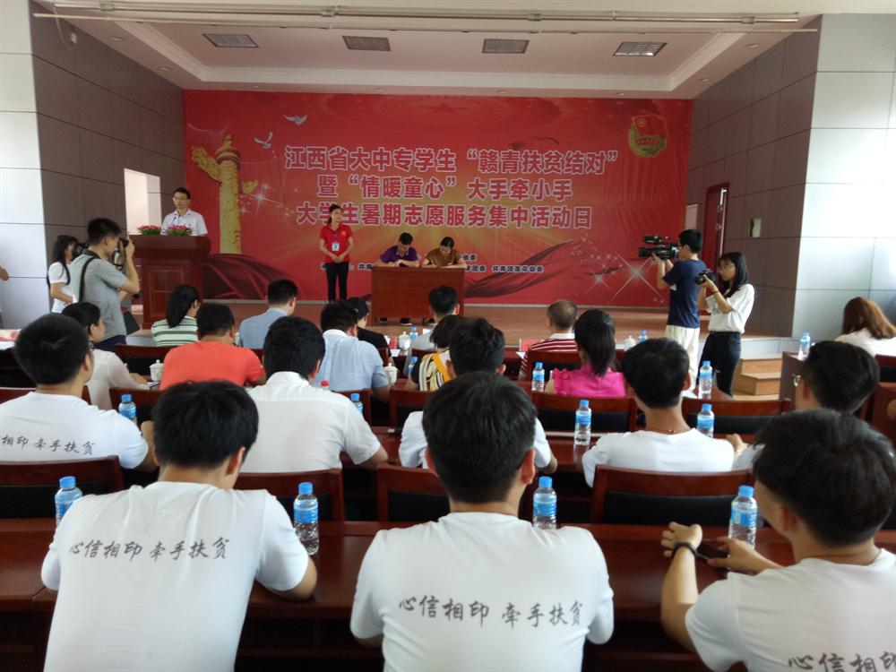 2017年7月5日上午11点,外国语学院7位学生志愿骨干在外国语团总支书记彭侃老师的带领下与六市小学的校长和几位老师还有10名优秀少先队员代表,一同前往萍乡市莲花县良坊镇一楼大会议室参加江西省大中专“赣青扶贫结对”暨“情暖童心”大手牵小手大学生暑期志愿服务集中活动启动仪式,参加本次会议的有团省委党组副书记马健,团省委学校部部长章学彭,江西省学生联合会驻会执行主席王莉莎,以及萍乡市的县委书记、副书记,团萍乡市委书记、副书记、学少部部长、良坊镇党委书记,团莲花县委书记,还有南昌大学,江西师范大学,南昌大学信息工程学院,江西科技师范学院的团委书记,党委书记等以及萍乡学院团委书记刘德平,团委副书记谢伟萍,以及外国语学院团总支书记彭侃。