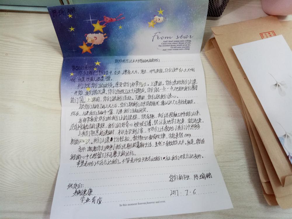 7月6日上午,由外国语学院支教老师带领孩子们所开展的感恩教育课堂无疑是成功的。活动结尾处孩子们也对支教老师们表示,希望他们能对其信中的内容进行适当的点评。信中所写内容丰富感人,有的写的是生活点滴中的细节,比如奶奶对自己的关爱及无私付出;有的写对老师平日里对自己谆谆教诲的感谢之情;有的描述与朋友在校园中的美好时光,表达对身边亲近朋友的喜爱并在信中指出其缺点望其改正,表示未来要手牵手一起走下去;有的表达对这一周支教老师们的喜爱以及对老师之后离开的不舍;有的在信中向老师分享自己的小秘密及苦恼,如有学生说道父母常年不在家的孤寂及对他们的想念或是妈妈对哥哥过度关心表达自己也渴望妈妈的关爱等等。