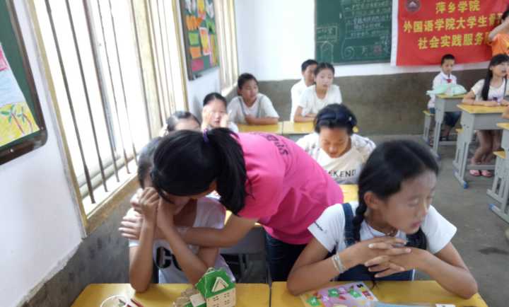 离别在即,似乎空气中有着淡淡的不舍。第一天支教时我们支教老师教孩子们学唱歌曲虫儿飞,最后一天是我们同样以歌曲虫儿飞作为我们暑期支教告一段落的尾音,孩子们一遍一遍的唱着,虫儿飞,虫儿飞,你在思念谁,以歌声表达对即将离开的支教老师不舍之情。一个女孩儿唱响虫儿飞时掩面哭泣了,我很心疼心中也深感温暖,那是纯真孩子的真情流露,我脑海中一幕幕浮现平时上课时的情景;课堂游戏的互动;课间的相互调侃;学生邀请一起走进他们的家中做客……我立马走到她身旁,用手擦去她脸庞的泪花,轻声安慰。她在我耳边轻身说道老师你明年一定还要来,我舍不得你。那是孩子用稚嫩的声音在表达对我的喜爱与不舍,我当时无言,给了她一个爱的抱抱拍了拍了哭的哽咽的她,我心里默默说道很喜欢你,愿你一直开心快乐。