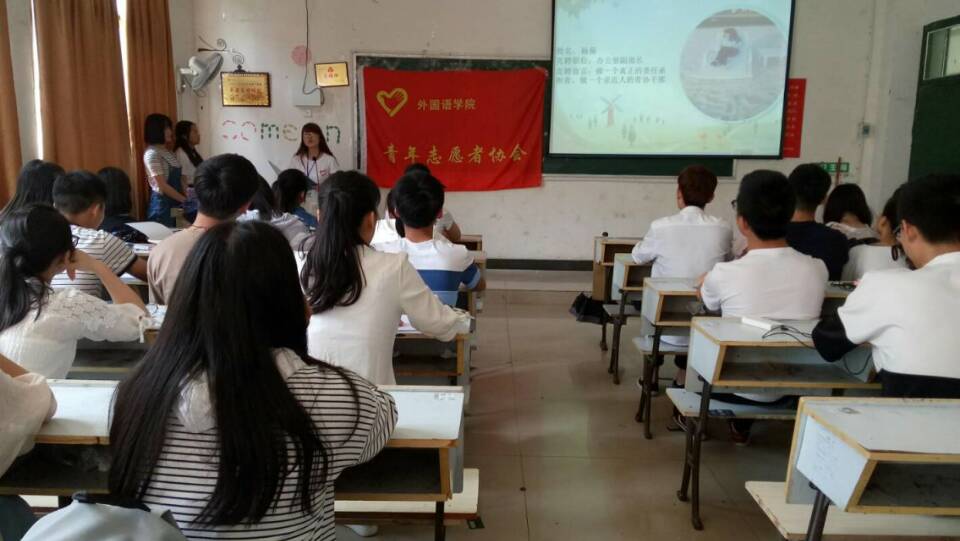 2017年5月16日,星期二,中午12:40,外国语学院青年志愿者协会在英华楼3306,举办第三届副部长的竞选活动。参加本次活动的有外国语学院青协会长余作敏,副会长廖晨、徐玉玲、潘佳锋、王爱琴,各部门部长,16级青协全体干事。