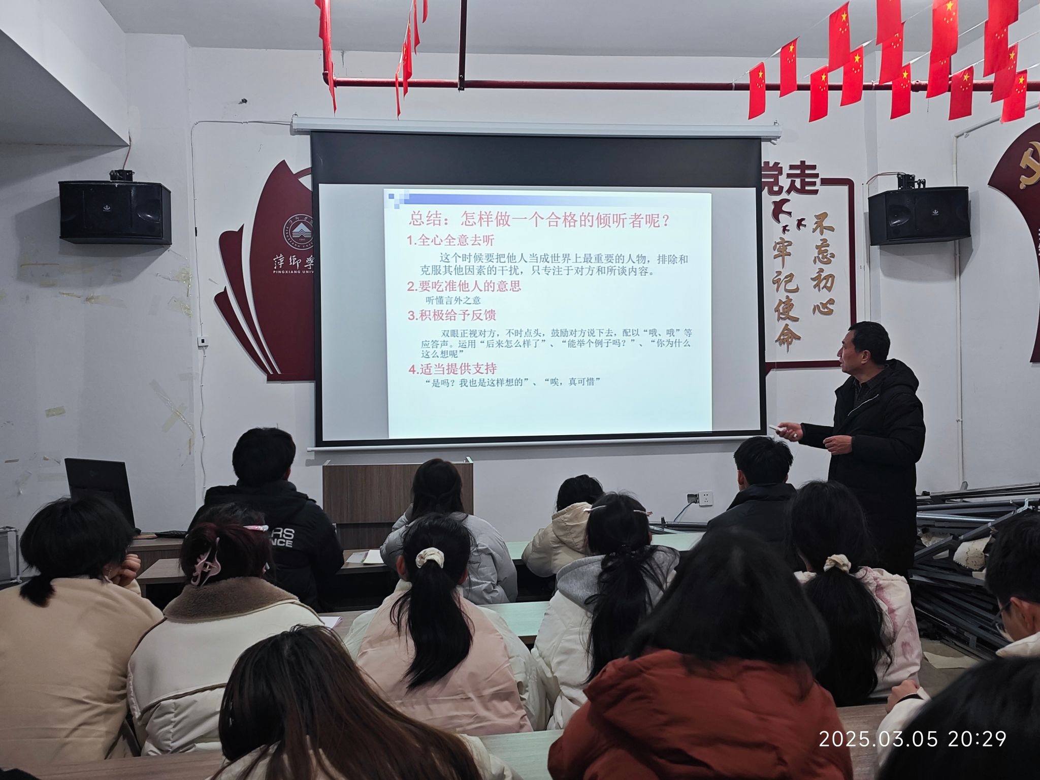 为了提升心理骨干和安全委员的专业能力,2025年3月5日,外国语学院在18栋宿舍一楼的“红管家”举行了一场心理专业能力培训,参加本次培训的同学为外国语学院心理站的心理委员、朋辈辅导员以及各班安全委员。本次培训主题为“我要成为倾听高手”,主讲老师是王卫民。外国语学院党委副书记曹金萍老师莅临现场指导。