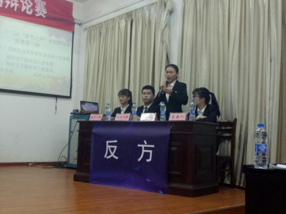 本场辩论的主题为做学生干部威信力重要还是亲和力重要。我想或许许多学生干部也被这一问题困扰着。辩论赛一开始,作为反方的外国语学院就展现出独特的风采,以情景剧《拉赞助》的方式引出了他们的观点:认为学生干部将自身定位为服务者,要求学生干部将亲和力放在第一位,且引用习近平总书记的话“人和才能政通,同志之间、上下级之间以及部门之间以“人和”为乐,以团结为贵,以协作为重,是事业成功的关键。”且亲和力带来归属感,化被动为主动,亲和力使同学们参与团队工作之中,群策群力。亲和力使学生干部与同学们更亲近,更好的了解同学,更好为同学服务。正方辩友引用古语“有威则可畏,有信则乐从,凡欲服从者,必兼备威信。”认为做为学生干部具备威信是最重要的。认为学生干部应提高自身业务素质,以才取信。