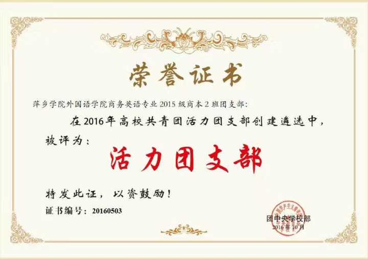 应团中央学校部《关于开展高校共青团“活力团支部”创建遴选活动的通知》有关要求,外国语学院15商本2班积极开展相关活动,最后在2016年高校共青团活力团支部创建遴选中,被评为“活力团支部”。
