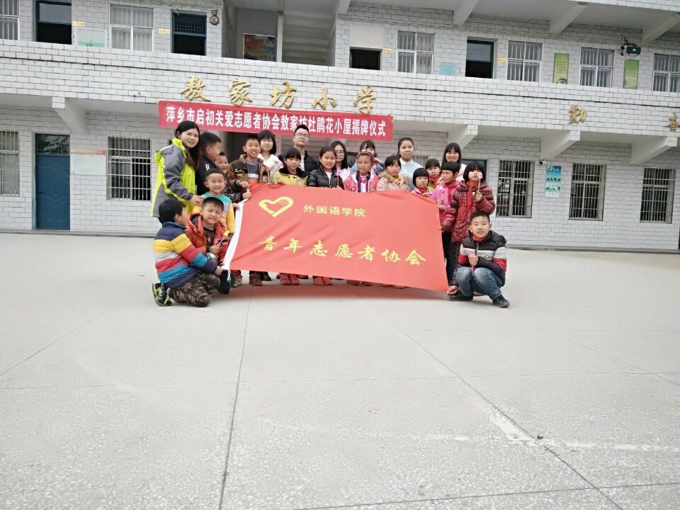 为大力弘扬雷锋精神、志愿精神和启初精神,为全社会关心青少年成长提供平台,2017年3月27日,下午3:00,外国语学院青协与杜鹃花小屋于芦溪县银河镇敖家坊小学举行揭牌仪式。参加本次活动的嘉宾有:会长余作敏,副会长王爱琴,会长助理巩乐、吴晨晨,青协部分支教人员,启初协会会长张敏萍,以及萍乡市领导。