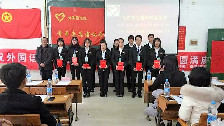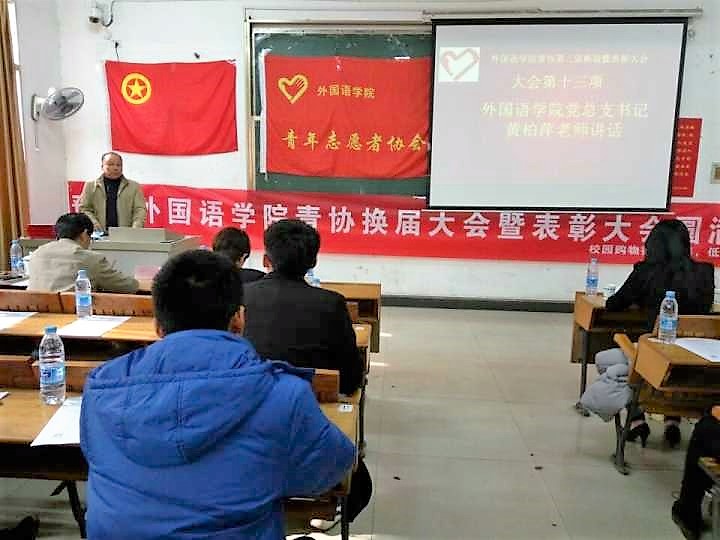 2016年12月1日,星期四,中午12:30,外国语学院青协迎来了第三届换届暨表彰大会。参加本次大会的嘉宾有外国语学院外国语学院党总支部书记黄柏萍、副书记刘佳萍、指导老师廖宇沙、前任会长陈瑜、15级全体理事会成员、16级全体理事会成员、茶亭学校与十里村小学校长、交警大队代表、四大媒体代表以及16级全体青协干事。