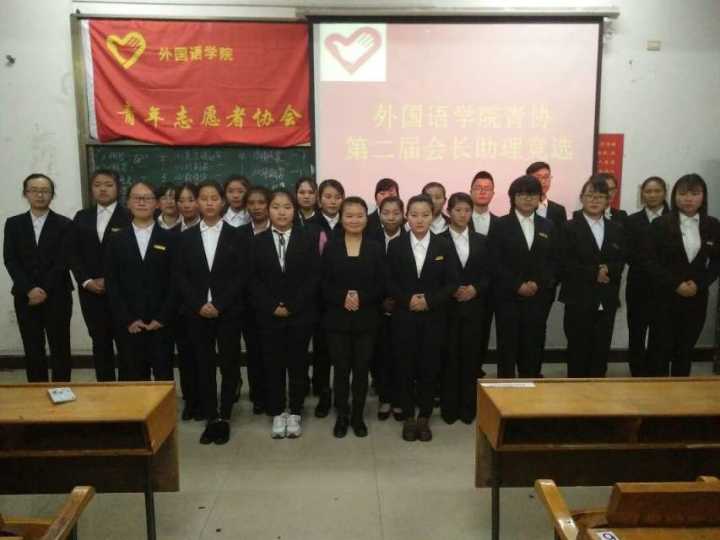 2016年12月8日,星期四,下午16点,外国语学院青年志愿者协会在英华楼3306,举办第二届会长助理竞选。参加本次活动的有外国语学院青协会长余作敏,副会长廖晨、徐玉玲、潘佳锋、王爱琴,各部门部长,16级青协全体干事以及外国语学院16级各班班长、团支书。
