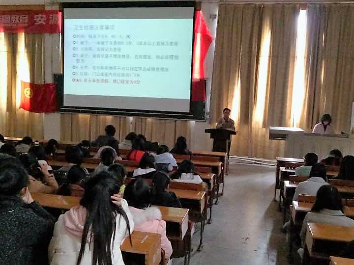 刘佳萍副书记首先为大家介绍了寝室的卫生问题及校、院宿管会的检查时间和标准。然后,他为大家讲述了大功率的危害以及有关断电、加压等问题上的申请。晚归问题也是一个重要的寝室安全问题,所以刘佳萍副书记重点提到了这点,并希望大家自爱自重,保护好自己。其次是内务整理问题,寝室也算是大家的另一个家,每个人都希望自己生活在干净整洁的环境中,所以,刘佳萍副书记也希望大家能打扫好寝室卫生,整理好内务。之后,外国语学院宿管会主任胡君进行相关问题的补充,特别是大家比较关心的维修问题,并对刘佳萍副书记的这次讲座进行总结。
