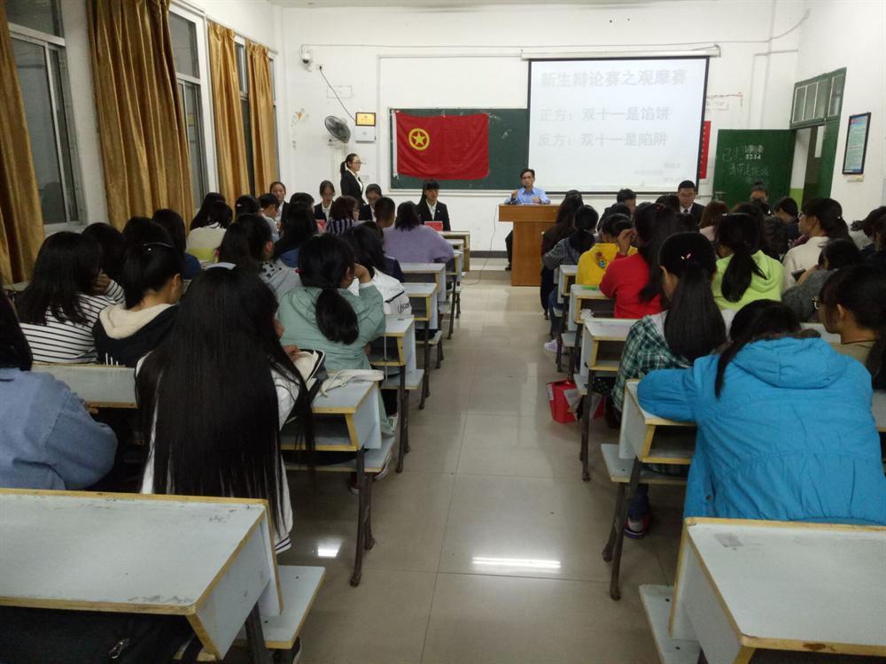 的观点。反方代表队则从双十一产品质量不能满足消费者需求导致退货率高,交易短时间完成导致的快递错漏发,短时间的集中消费对经济发展不能起明显作用等方面论证自己的观点。双方的观点激烈的碰撞,精彩之处,台下的同学也为他们鼓起掌来。辩论赛结束,反方代表队以