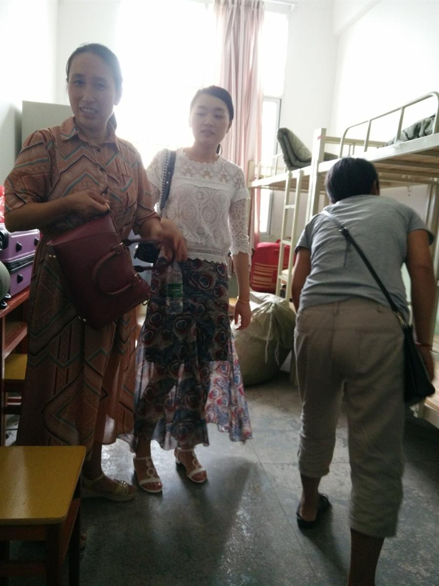 廖宇沙以及赖文萍老师一同下寝慰问新生。