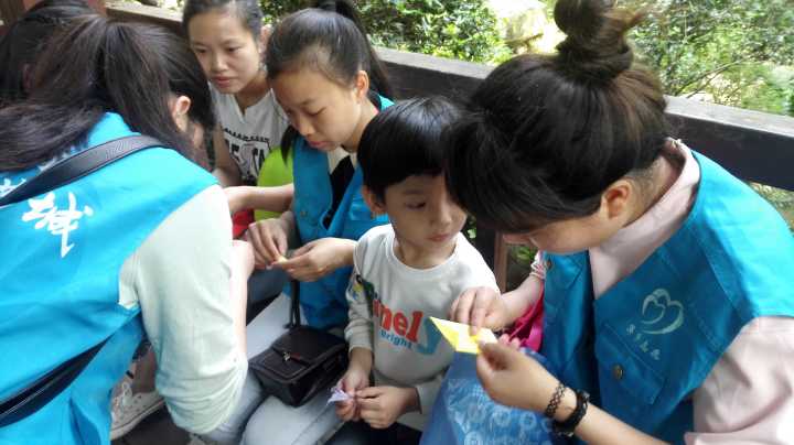 接下来,我们跟随家长们带着小朋友们到虎形山进行户外活动。本次户外活动过程中设有“谁是卧底”、“爬山比赛”等游戏,取胜者皆以折纸手工品作为奖品。进行户外活动游戏前,我们在虎形山对《论语》进行了第二次朗读。透过悦耳的朗读声,每个人的心里必定是美美的。随后,由几位外国语学院青年志愿者随当地的家长探路,计划进行了爬山比赛。然而,虎行山的山峰并不高,每个孩子都近于同一时间到达,部分孩子受到了奖励,而最后一位小朋友在其妈妈的鼓励下也欣然地接受了惩罚——表演朗诵。到这里,本次活动接近了尾声,活动结束后大家回到萍乡博物馆一楼萍乡志愿者服务中心,并且和萍乡蒲公英志愿者协会会长商议事情。为弘扬中国五千年来的文化及志愿者服务精神,萍乡蒲公英志愿者协会表示,希望我院在以后可以和其协会建立长期友好的合作关系。