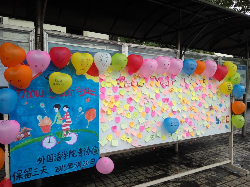 2016年5月20日,外国语学院青年志愿者协会在中心小广场举办了“浓情五月,show your love”的活动。参加此次活动的成员是外国语学院青协成员。