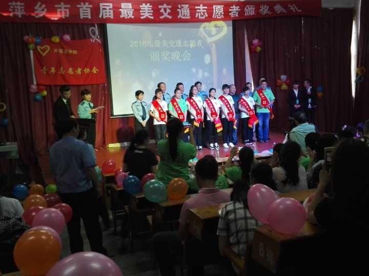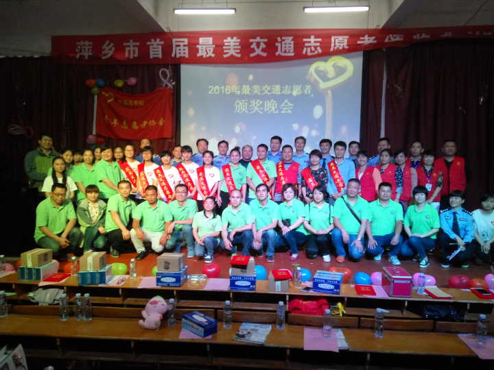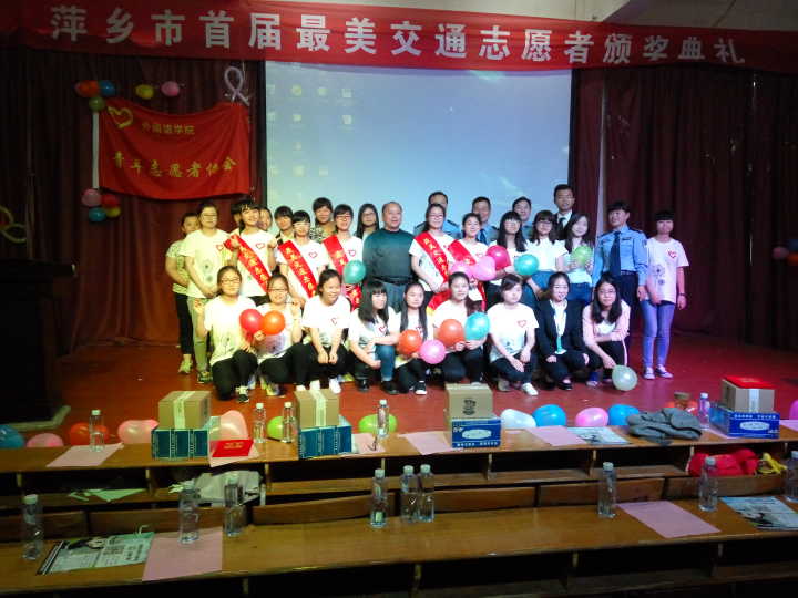 2016年5月26日16:20在跬步楼1115外国语学院青年志愿者协会联合萍乡市公安局交警支队安源大队、芦溪县公安局交警大队一起举办了“萍乡市首届最美交通志愿者”颁奖典礼。参加本次颁奖晚会的领导嘉宾有萍乡学院外国语学院党总支书记黄柏萍,青协指导老师廖宇沙,萍乡市公安局交警支队副支队长叶卫国、萍乡市公安局交警支队副支队长文乐目、纪委书记王飞、法宣科科长余汗章、安源交警大队大队长胡志文、教导员邬思国、副大队长刘波、芦溪交警大队大队长邓勇、教导员王永安、副大队长何文兴、杨健,启初志愿者协会、安源志愿者协会以及校、各院志愿者代表。