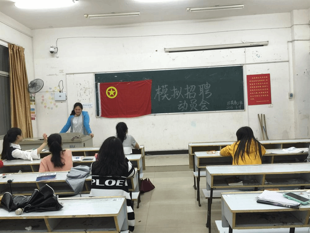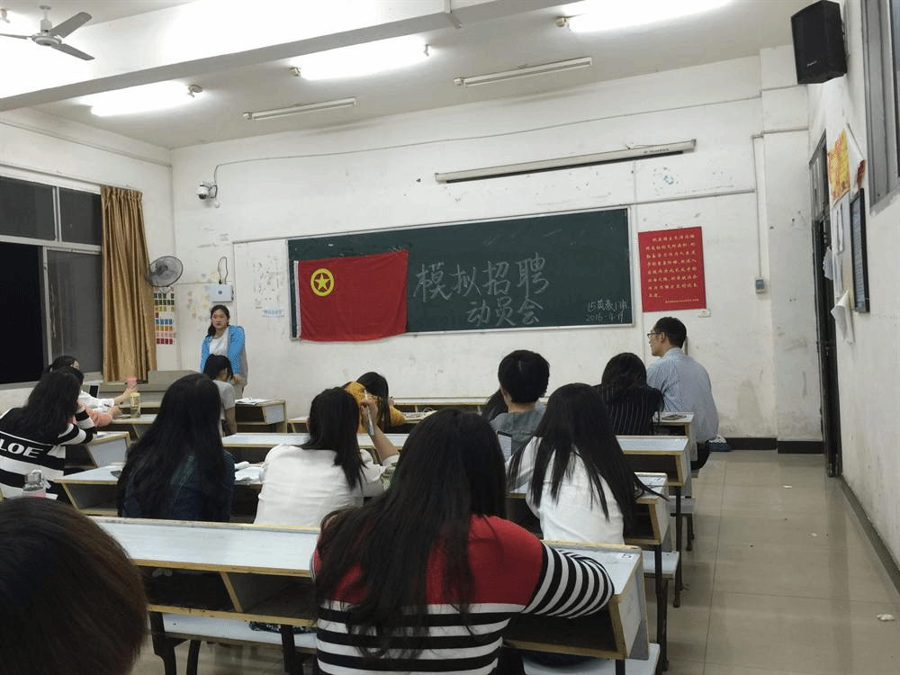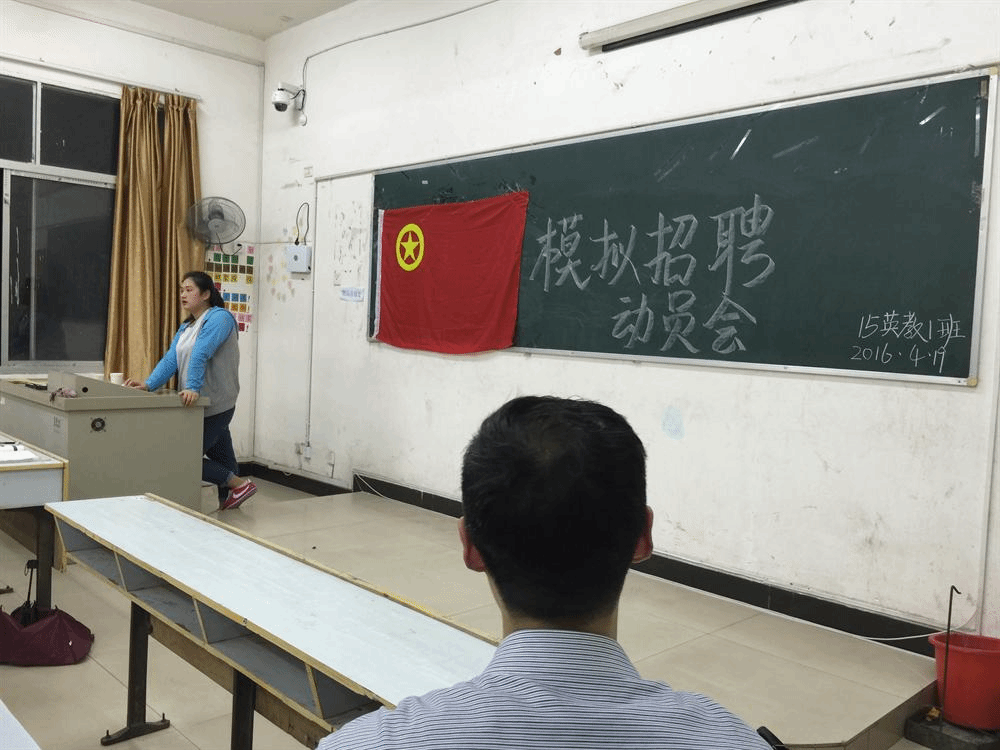 2016年4月19日晚自习,外国语学院15英教1班在班长的带动下召开了模拟招聘会,此次招聘会由班长组织召开,并担任本次班会的主持人。