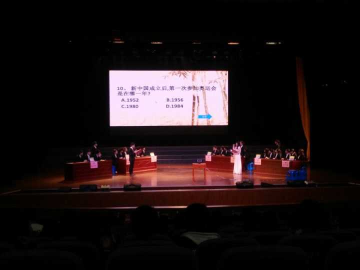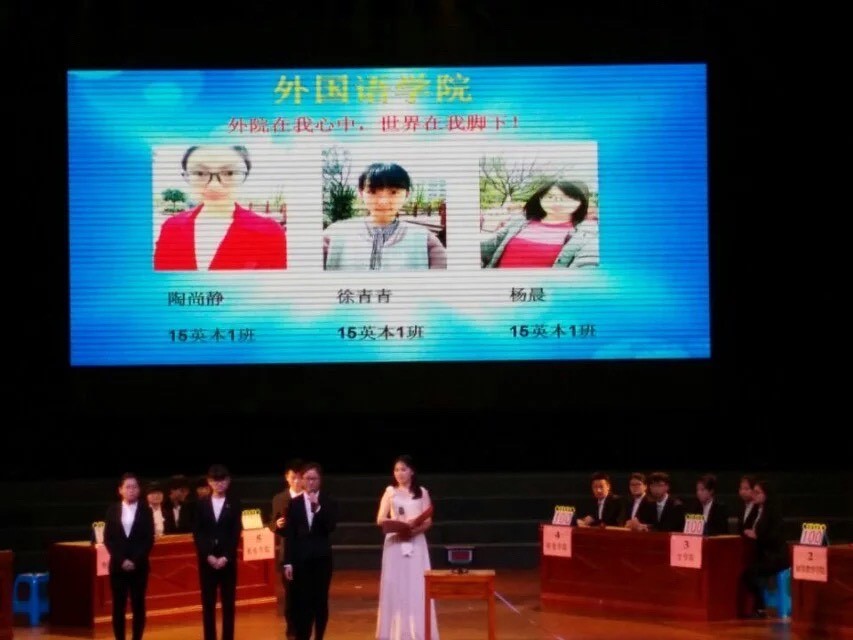 比赛正式开始,各位选手首先自我介绍,他们神采奕奕满怀斗志的说出自己的决赛宣言,台下的观众更是给予选手们最大的支持与鼓励。本次大赛共有五个环节:一、三题为必答题,二、四题为抢答题,最后一题是风险题。学院之间按照编号轮流答题。比赛题目涉及范围极广。一开始各学院成绩都不相上下。五轮下来台上只剩下外国语学院和机电学院的战神。他们就是今晚的战团之王。由于分数相同,来了一轮加赛题,经过激烈的比拼,最后因为一题之差,外国语学院与冠军失之交臂。但不管怎样,还是很棒,尽了我们最大的努力,这个时候输赢都已经不再重要。