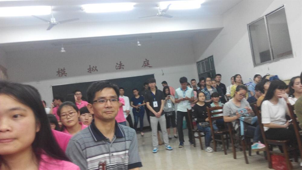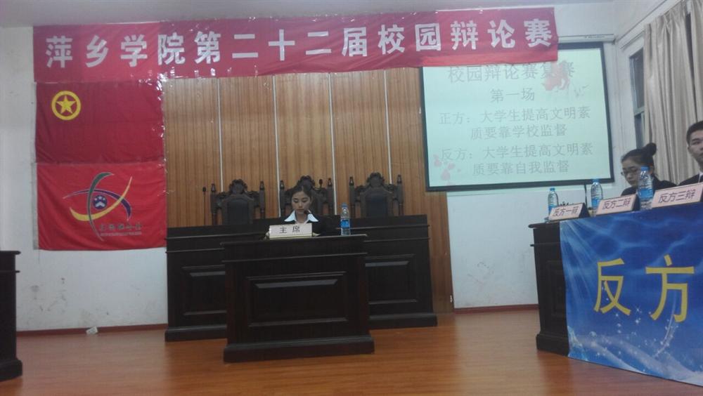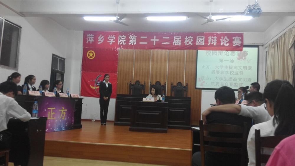 2016年5月6号19:00在英华楼模拟法庭举办辩论赛,教室里气氛火热。此次比赛有外国语学院对战初等教育学院。初等教育学院为正方,辩题是“大学生提高文明素质要靠学校监督”,反方辩题是“大学生提高文明素质要靠自我监督”。比赛邀请了朱敏,张涛,李达,刘德平,刘佳萍担任评委,魏峰为比赛嘉宾。出席比赛的有罗甜,乐丽玲,校优秀辩手以及外国语学院、初等教育学院15级学生。