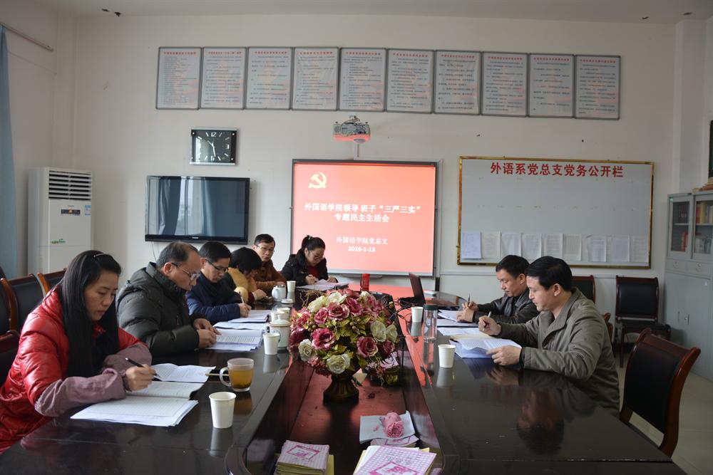 根据《中共江西省纪委机关、中共江西省委组织部关于开好“三严三实”专题民主生活会的通知》,按照学校统一部署,2016年1月13日,外国语学院在英华楼3319会议室召开领导班子“三严三实”专题民主生活会。萍乡学院宣传统战部部长陈永国,组织部副部长文胜初莅临此次专题民主生活会指导点评。会议由外国语学院党总支书记黄柏萍主持,外国语学院院长欧阳咏梅,副书记刘佳萍、学院党总支成员、民主党派教师代表、辅导员、班主任、青年教师代表参加会议。