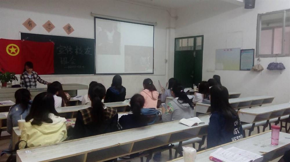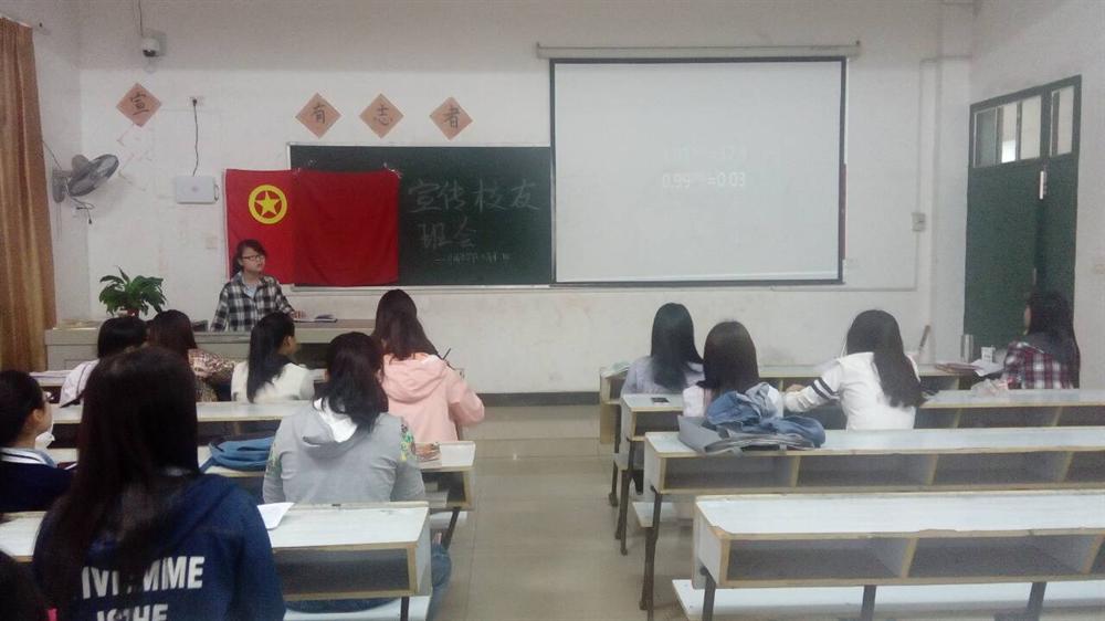 为了加强校友与母校,校友与校友间的联系,发挥桥梁纽带作用,加强校友基础工作建设。我班于4月22日上午七点在英华楼3420召开宣传校友班会。