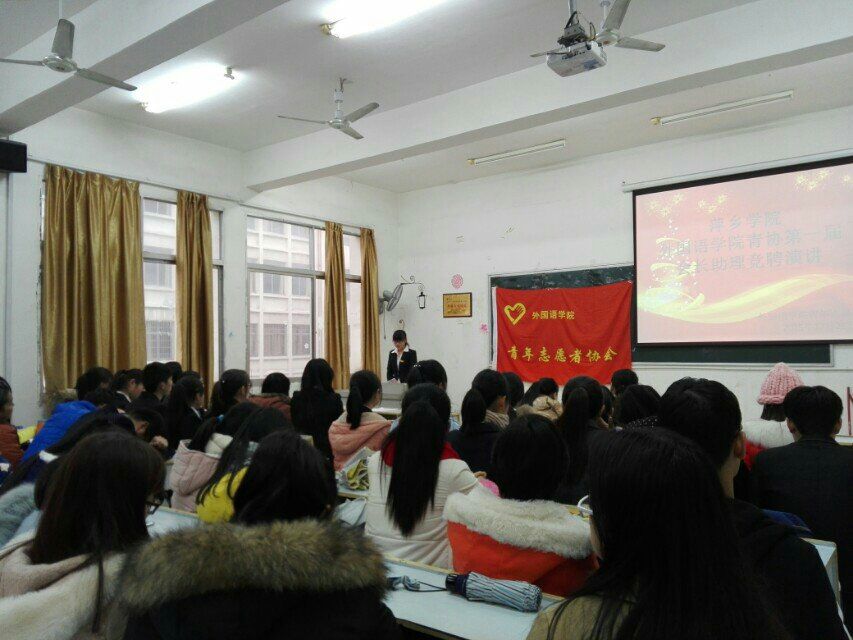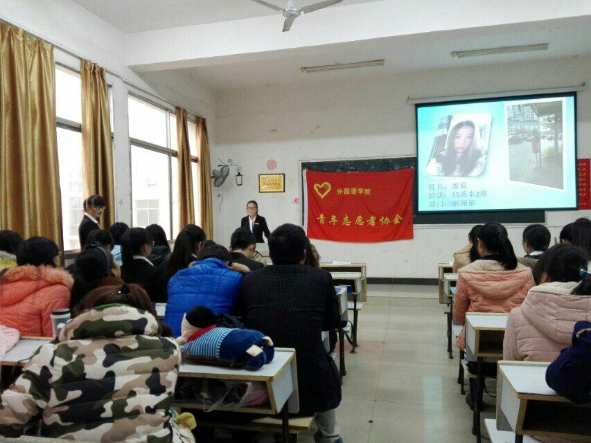 2015年12月22日,星期二,中午11:50外国语学院青年志愿者协会在英华楼3304召开例会。参加本次例会的有青协会长陈瑜、副会长陶洋杨、会长助理熊慧、各部门部长以及15级全体干事。