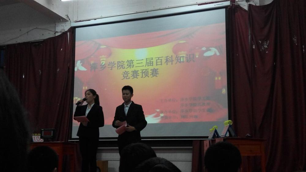为提高大学生的综合素质,拓展大学生视野,丰富大学生活。 2016年4月10日18:50,校学生会在跬步楼1115教室举行百科知识竞赛预赛。比赛分为两轮。第一轮参赛者有学前教育学院,材料与化学学院,机电学院,文学院,工程与管理学院,外国语学院;第二轮参赛者有商学院,政法学院,体育学院,信息与计算机工程学院,初等教育学院,艺术学院。百科知识竞赛现场观众有各学院15级同学,其中外国语学院团总支学生分会杨昌伦主席担任现场比赛嘉宾。