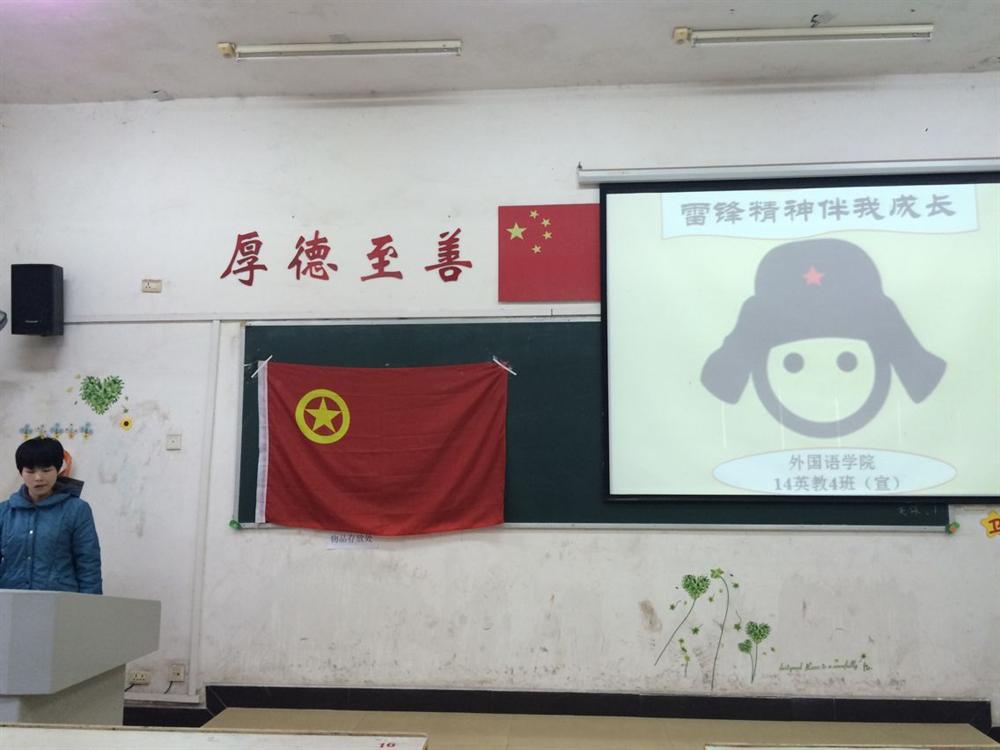 为响应“三月雷锋月”的号召,14英教4班全体同学于2016年3月21日在英华楼3101教室召开了以“雷锋精神伴我成长”为主题的班会。通过本次主题班会活动,让同学们深刻认识到“雷锋精神”在生活中的重要意义。