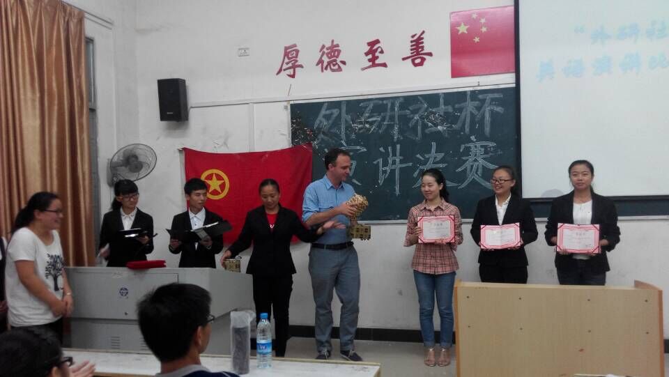 9月28日,中秋佳节已过,但月亮还是格外的圆,正如俗语所说十五的月亮十六圆。而在教学楼的另一边六点三十分3504教室正在举行着“外研社杯决赛”,偌大的教室里坐满了学生。参赛者们佳节过后都精神饱满,身着黑色西装象征着对比赛的认真,而充满活力的外表在黑色西装的衬托下显得格外的自信。