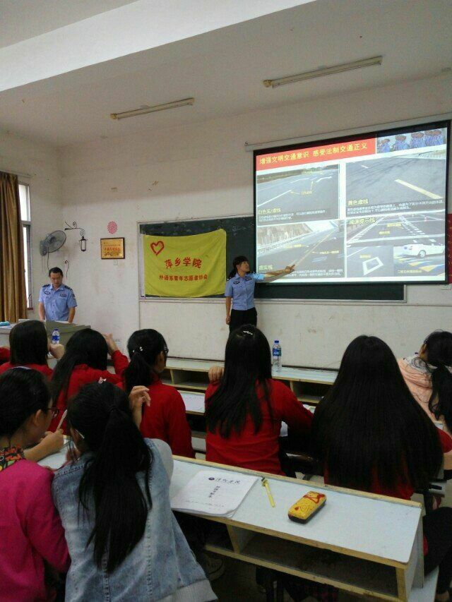 10月9日,下午四点三十分外国语学院青年志愿者协会在英华楼3304举行交通协管知识讲座。参加本次讲座的有汤中午、王萍等安源区交警大队的队员,会长陈瑜,副会长陶洋杨,会长助理熊慧,各部门部长以及15级全体成员。