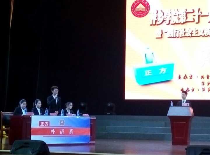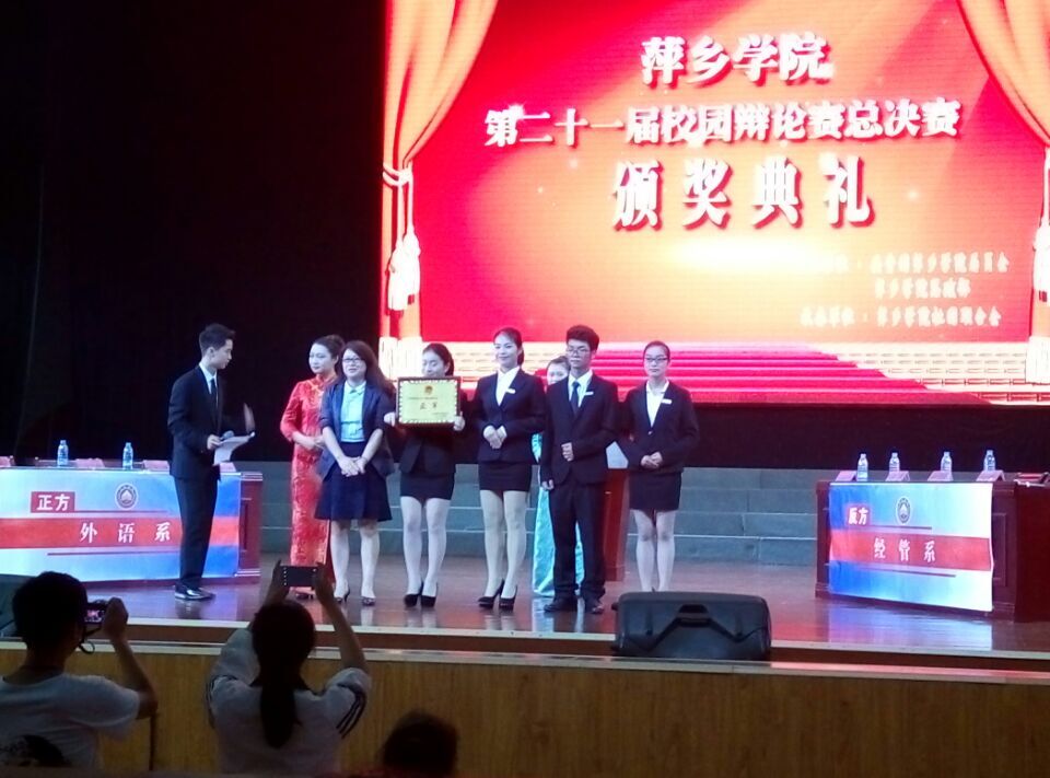 5月22日晚,由校团委、思政部主办,校社联承办的萍乡学院第二十一届校园辩论赛总决赛暨“践行社会主义核心价值观”主题辩论赛在音乐厅举行。莅临本次比赛的评委有:校党委委员、副院长郭伟,团市委副书记汤艳红,团市委城农青部部长潘玉洁,校团委书记刘德平,学工处副处长丁勇,外语系党总书记黄柏萍等。各系部团总支书记、副书记、学生会主席及各系部学生代表观看了此次比赛。