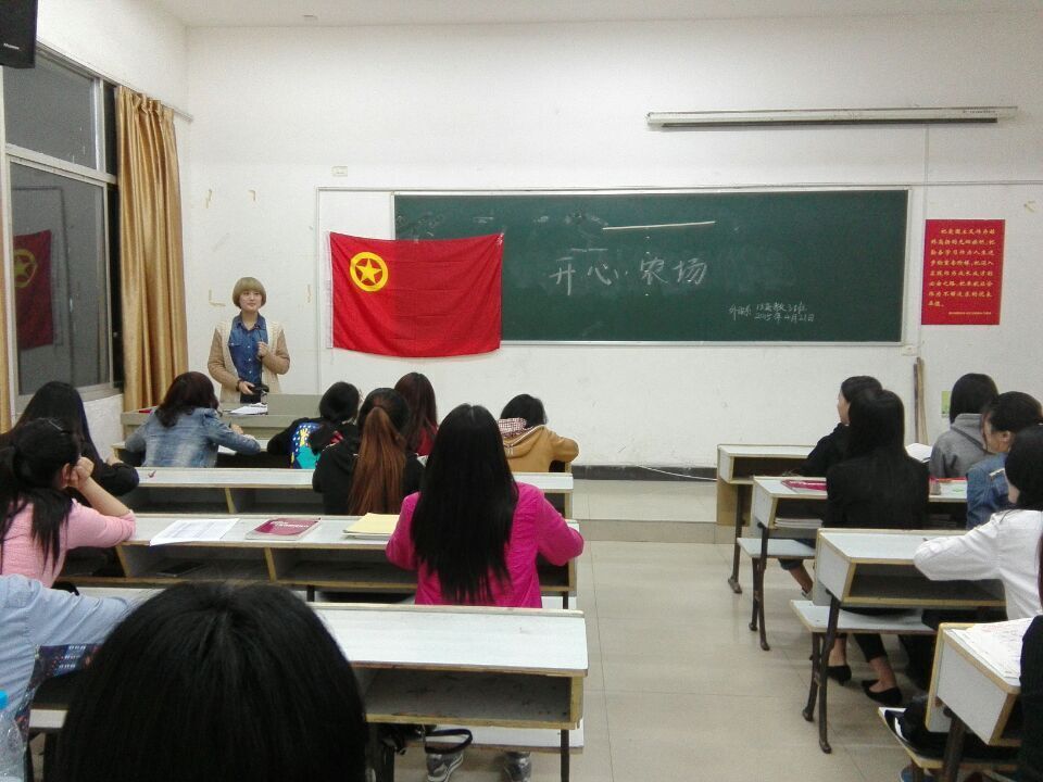 2015年4月21日,外语系13英教3班副班长朱迪在3309教室召开了以“开心农场”为主题的班会活动。