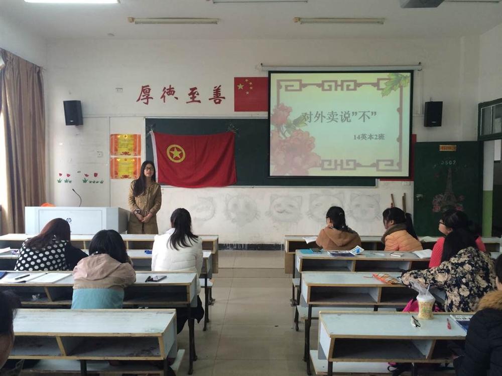 俗话说:“民以食为天,食以洁为先,食以安为本”。自古以来,不乏寻觅美食之人,当今社会,追求美食更成为一种追求高档生活的时尚。针对同学们越来越依赖外卖这一现象,外语系14英本2班开展“对外卖说‘不’”主题班会,此次班会由团支书张媛负责主持。