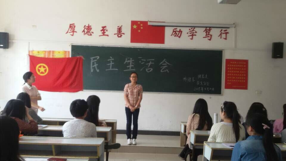 今天在英华楼3508召开了外语系团总支民主生活会。会议的主要内容是谈谈成员的工作心得,经验和想法。主席团杨昌伦张婷杰等率先说出了自己的想法。他们主要说了对团总支成员的感谢,因为大家的积极配合雷锋月的各项活动的才能顺利举办。接下来其他部门成员和团支书也陆续上台发言,说出了自己的一些不足和改进的方法。也表达了对团总支的美好前景的憧憬。我想有这么多的负责任志同道合的同志在一起奋斗,这个组织一定会越办越好的。