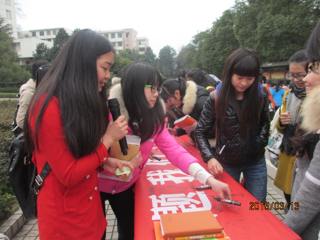 3月13日周五中午,阳光有些许羞涩,外语系在中心小广场进行了学雷锋签名活动。外语系团总支副书记蒋蓉带领团总支的成员们热情地邀请大家前来签名。