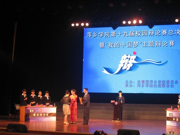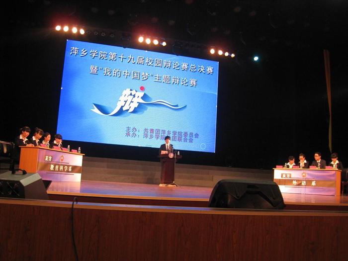 2013年5月24日晚7:30,在音乐厅举行“我的中国梦”主题辩论赛总决赛,本次辩论赛由校团委主办,校社联承办。出席本次辩论赛决赛的评委有团市委书记、副书记、副校长、校团委书记以及各系部学生。决赛双方是正方教育科学系和反方外语系。
