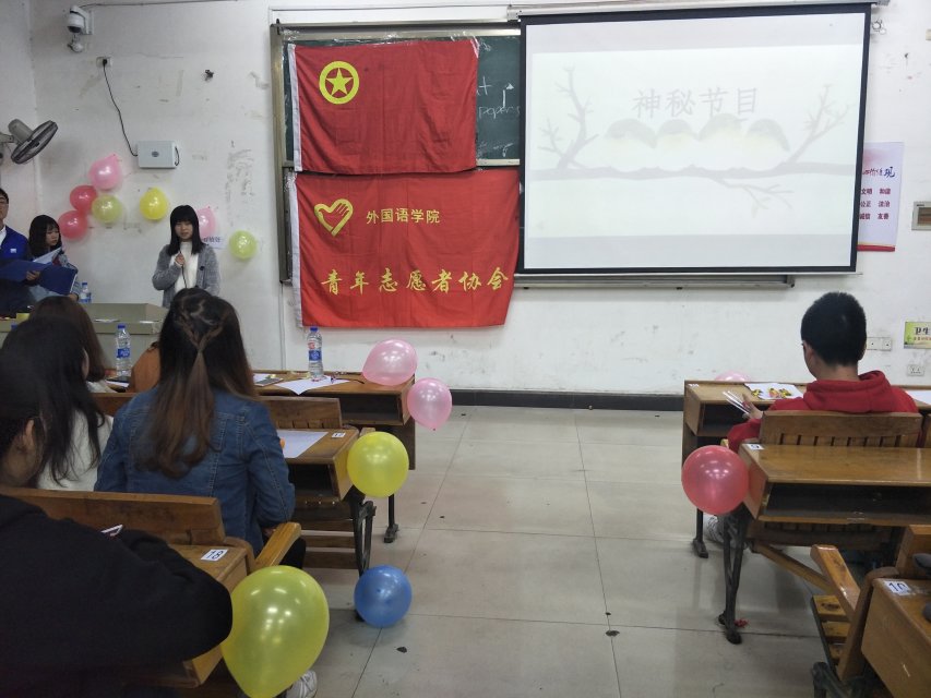 2017年11月11日,星期六,晚上7:00,外国语学院青年志愿者协会在英华楼3306召开新老生内部交流会,参加本次例会的有会长施娴琛,副会长巩乐、王丽、魏井坤、吴志瑶,各部门部长,15级理事会成员及17级全体成员。