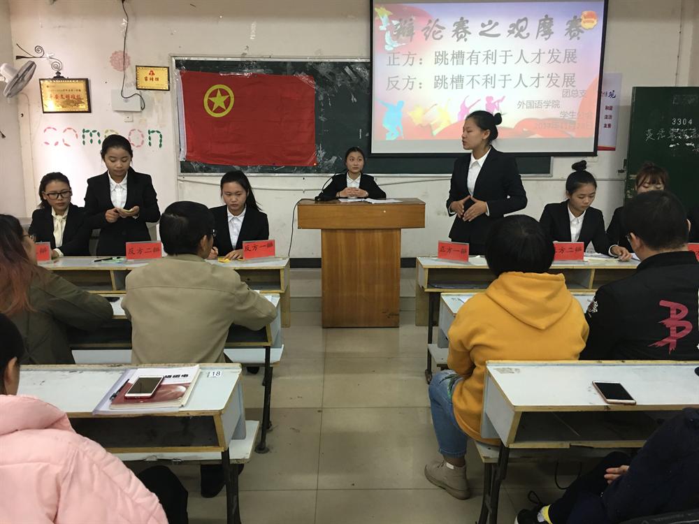外国语学院于11月28日中午12.40,在3304举行辩论赛之观摩赛。出席本次比赛的有外国语学院党总支副书记刘佳萍、外国语学院团总支书记彭侃、外国语学院主席团成员、部分部门部长以及校优秀辩手程安娜、章昱以及院优秀辩手曾艳、毛芳婷。