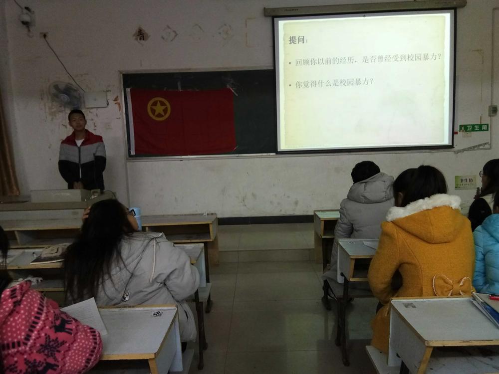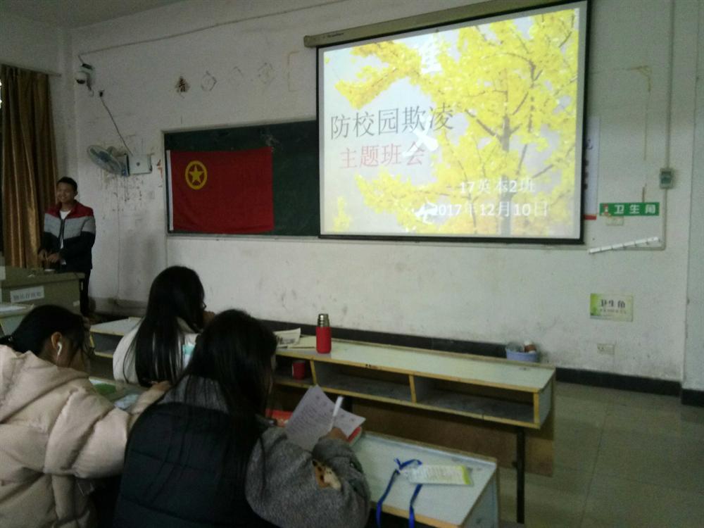 2017年12月10日,星期日,晚上19:50,外国语学院17英本二班在英华楼3337召开防校园欺凌的主题班会,组织本次班会的是学习委员,参加本次班会的是17英本二班全体同学。