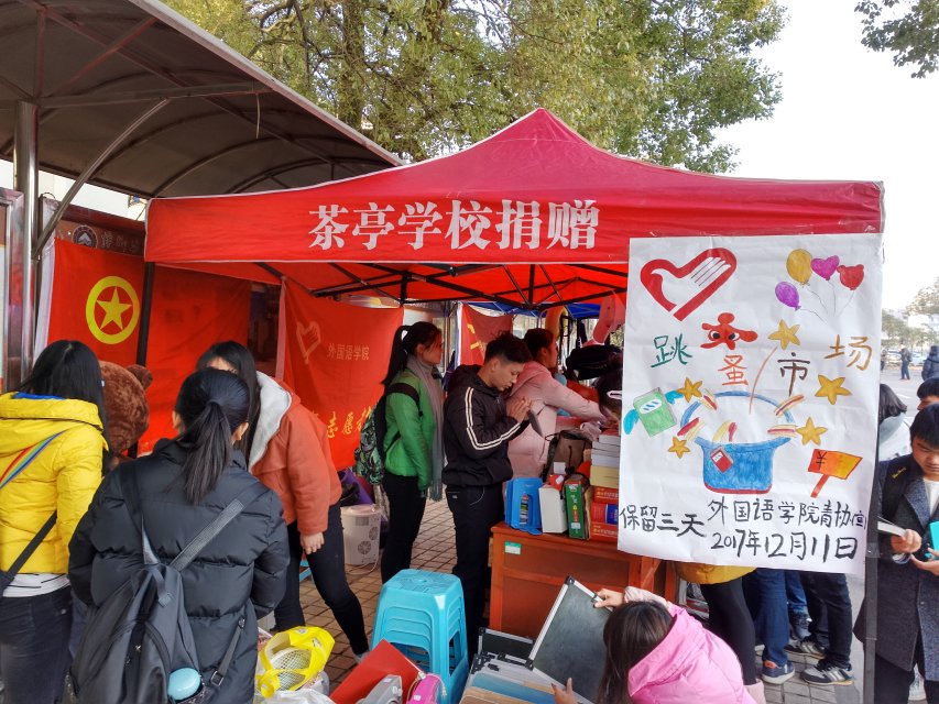 为了秉承“奉献、友爱、互助、进步”的志愿精神,也为了在给同学们提供一个交换资源的平台的同时提高同学们勤俭节约的意识,2017年12月11日至13日,外国语学院青协举办了跳蚤市场活动。参加本次活动的有会长施娴琛,副会长吴志瑶、王丽、巩乐、魏井坤,各部门部长及17级全体成员。