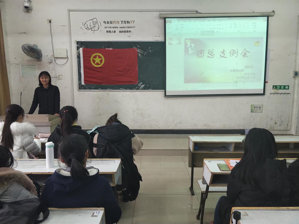 为了促进各个部门默契的配合,16、17级团支书熟悉自己的工作,2017年12月13日11:50,外国语学院于3307教室召开团总支例会。出席本次会议的有人员有外国语学院团总支副书记文婷喻,团总支部门成员以及16、17级团支书。