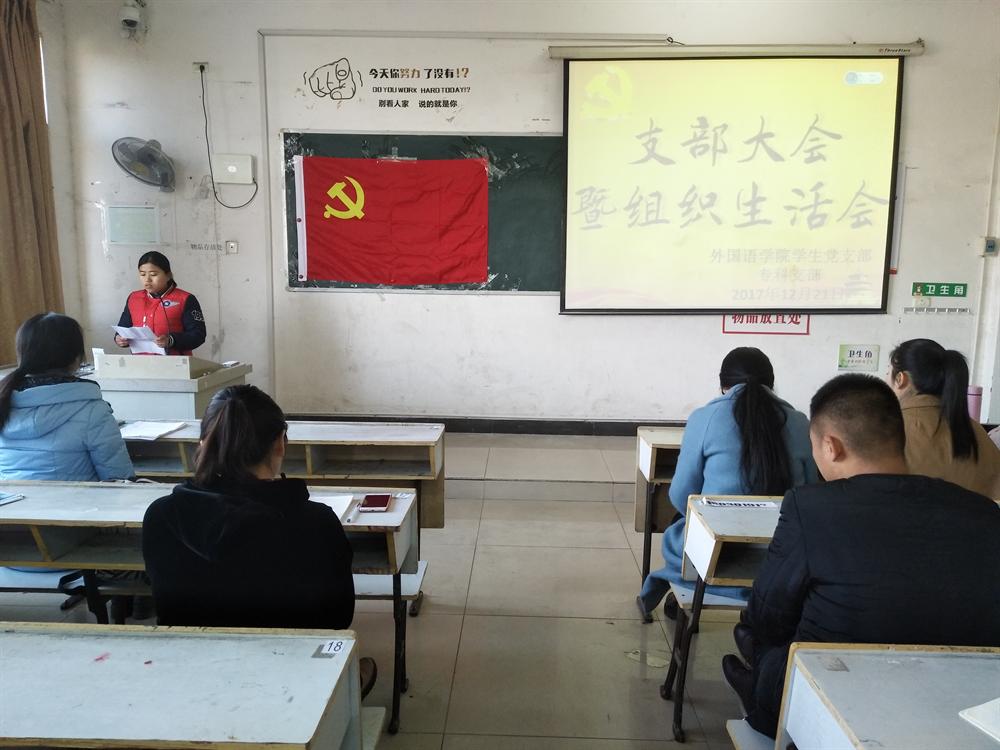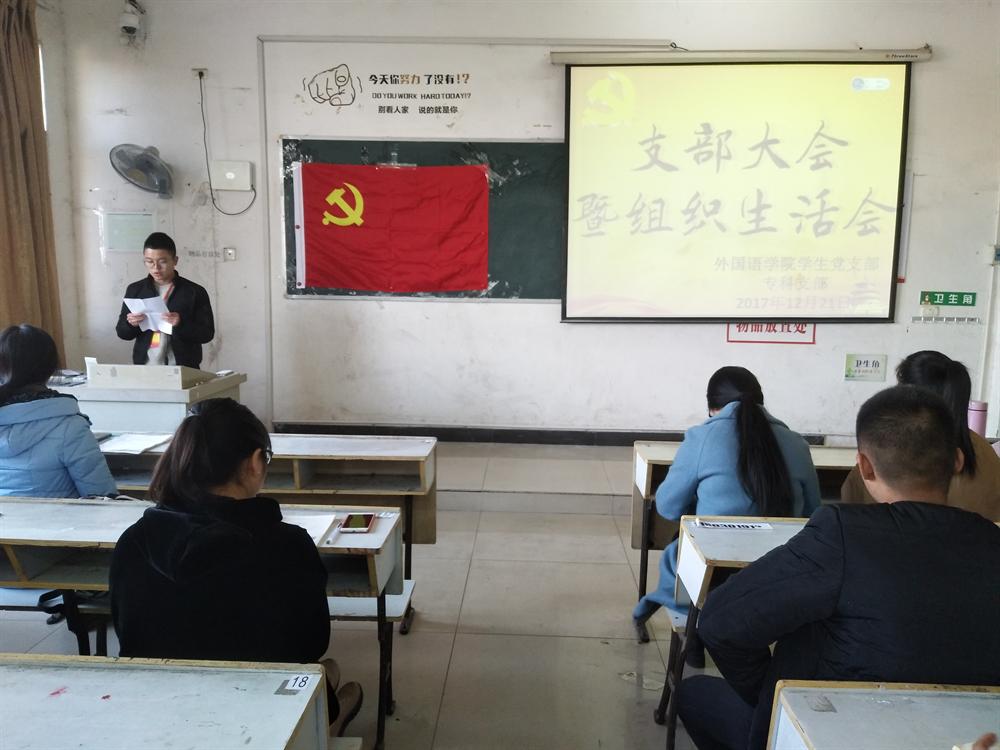为进一步发扬党的优良传统,保持党内同志思想的先进性,提高党员党性修养,充分发挥先锋模范作用,外国语学院学生党支部本科支部、专科支部于2017年12月21日中午12时40分分别在3304、3307教室召开支部大会暨组织生活会。