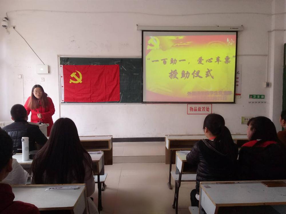 2017年12月21日下午16时,外国语学院学生党支部于英华楼3333教室举行“一百助一,爱心车票”受助仪式。参加本次仪式的有外国语学院学生党支部书记彭侃、16、17级辅导员赖文萍,外国语学院学生党支部各支委,大一、大二各班班长、团支书以及受助人。主持人为学生党支部纪检委员魏婷。