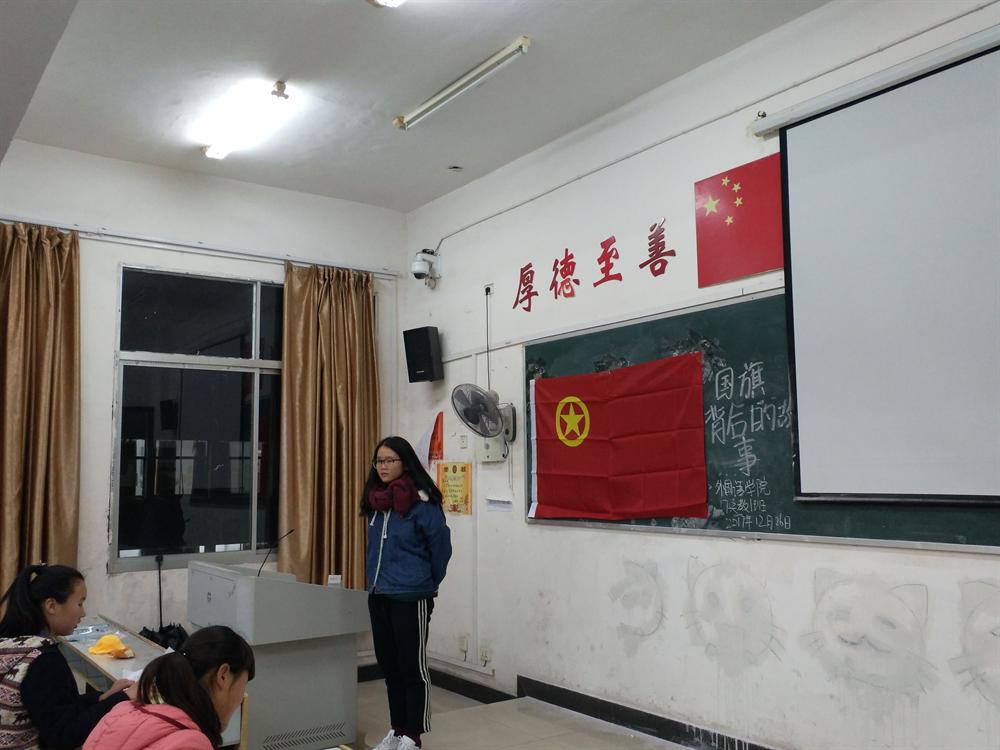 为了让大家能够更加了解的国旗,17英教一班特地举办此次主题班会活动。众所周知,国旗是一个国家不可缺少的部分,象征着一个国家曾经的荣誉与辉煌。国旗在我们从小接受的教育中,他是被革命战士的鲜血所染成的。无论事实与否,他在我们心目中所占的分量,从此便扎根深种。死亡与灵魂,精神与肉体,在国旗这里的凝聚;人民与民族,国家与希望,在国旗这里凝聚;曙光与黑暗,平静与安稳,在国旗这里凝聚。