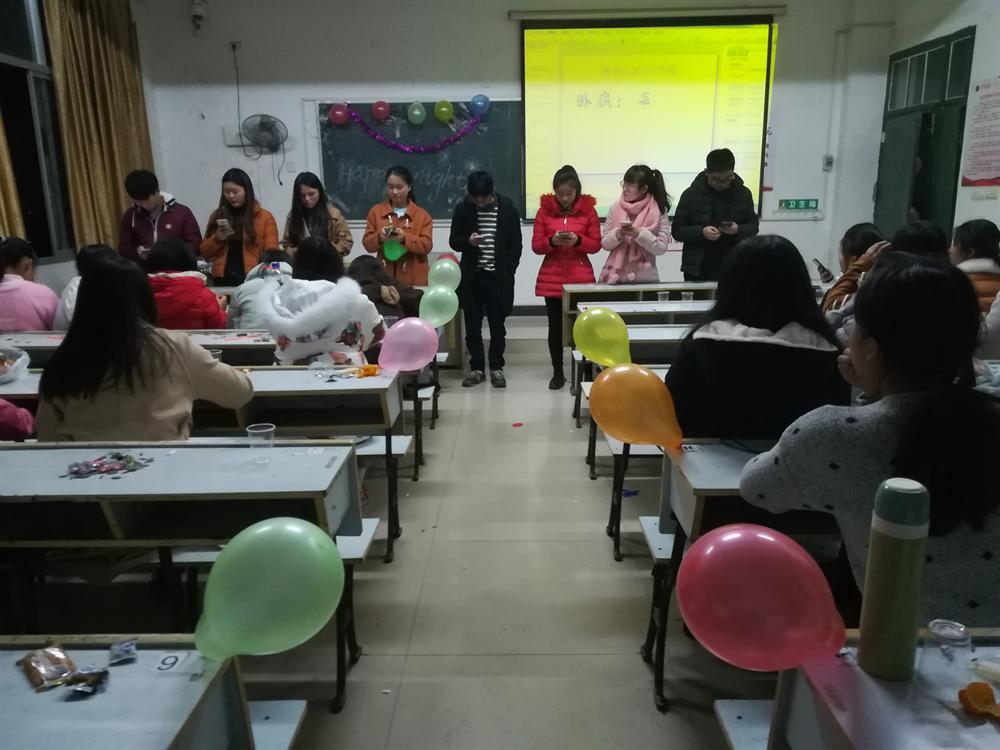为增进不同年级同学的感情,2017年12月22日晚上7:00,外国语学院17商英1班与16英教3班于英华楼3331开展联谊活动,活动由文体委员王域圆主持,16、17级同学参与。