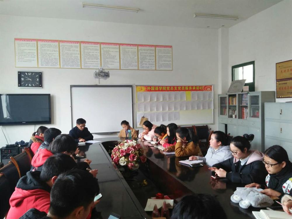 1月11日,外国语学院副书记刘佳萍在3319主持召开2017-2018年度期末安全会议,学院14、15、16、17本专科各班班长参加了会议。