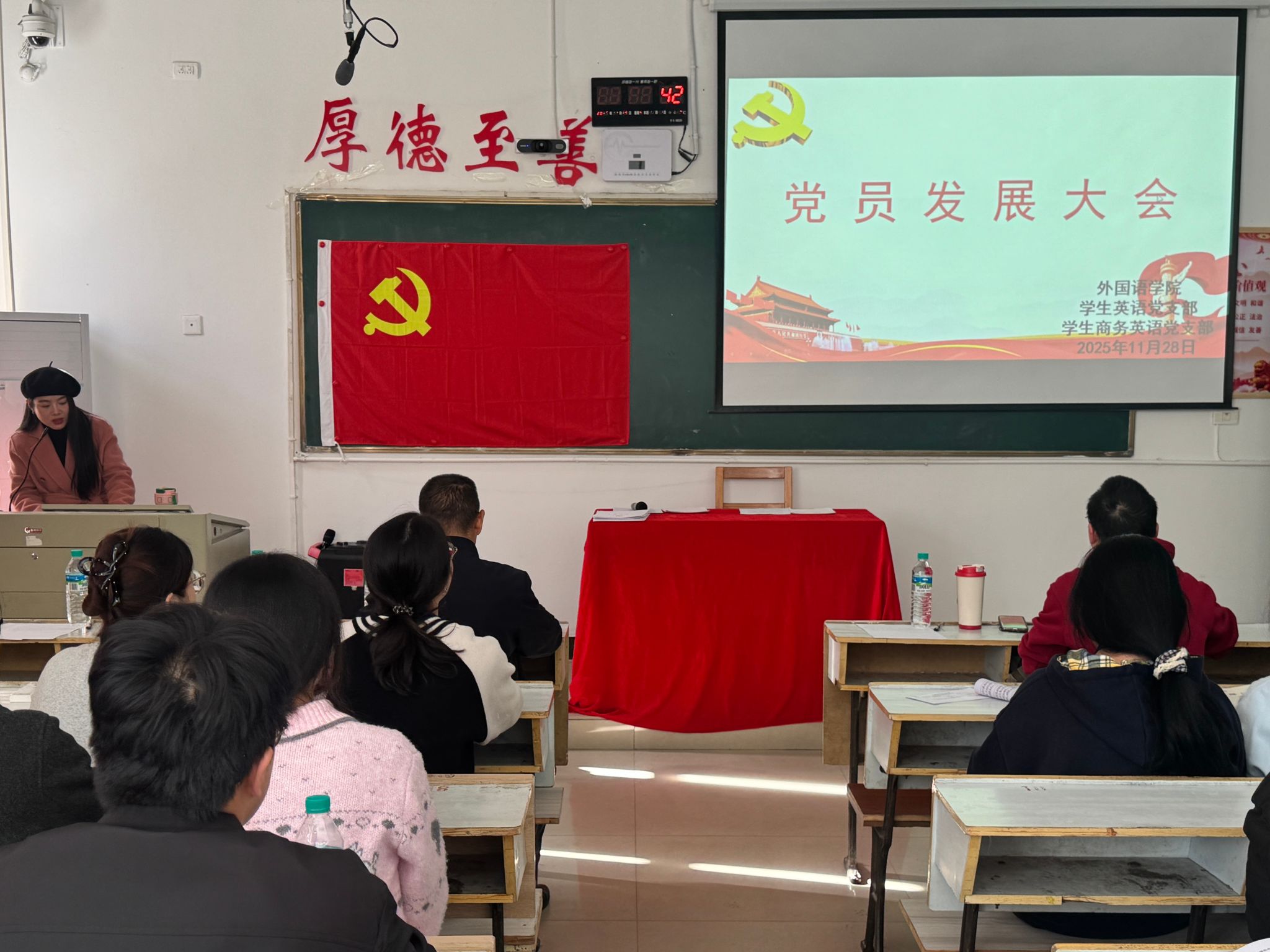 为确保党员发展质量,增强党组织凝聚力,2025年11月28日下午2时整,外国语学院学生英语党支部于英华楼3304教室召开党员发展大会,讨论张颖、陈三宝等4名发展对象的入党问题。参加此次大会的有外国语学院党委书记刘佳萍,外国语学院学生英语支部书记钟倩、外国语学院学生商务英语支部书记何宇以及支部全体党员。大会由外国语学院学生英语党支部书记钟倩主持。