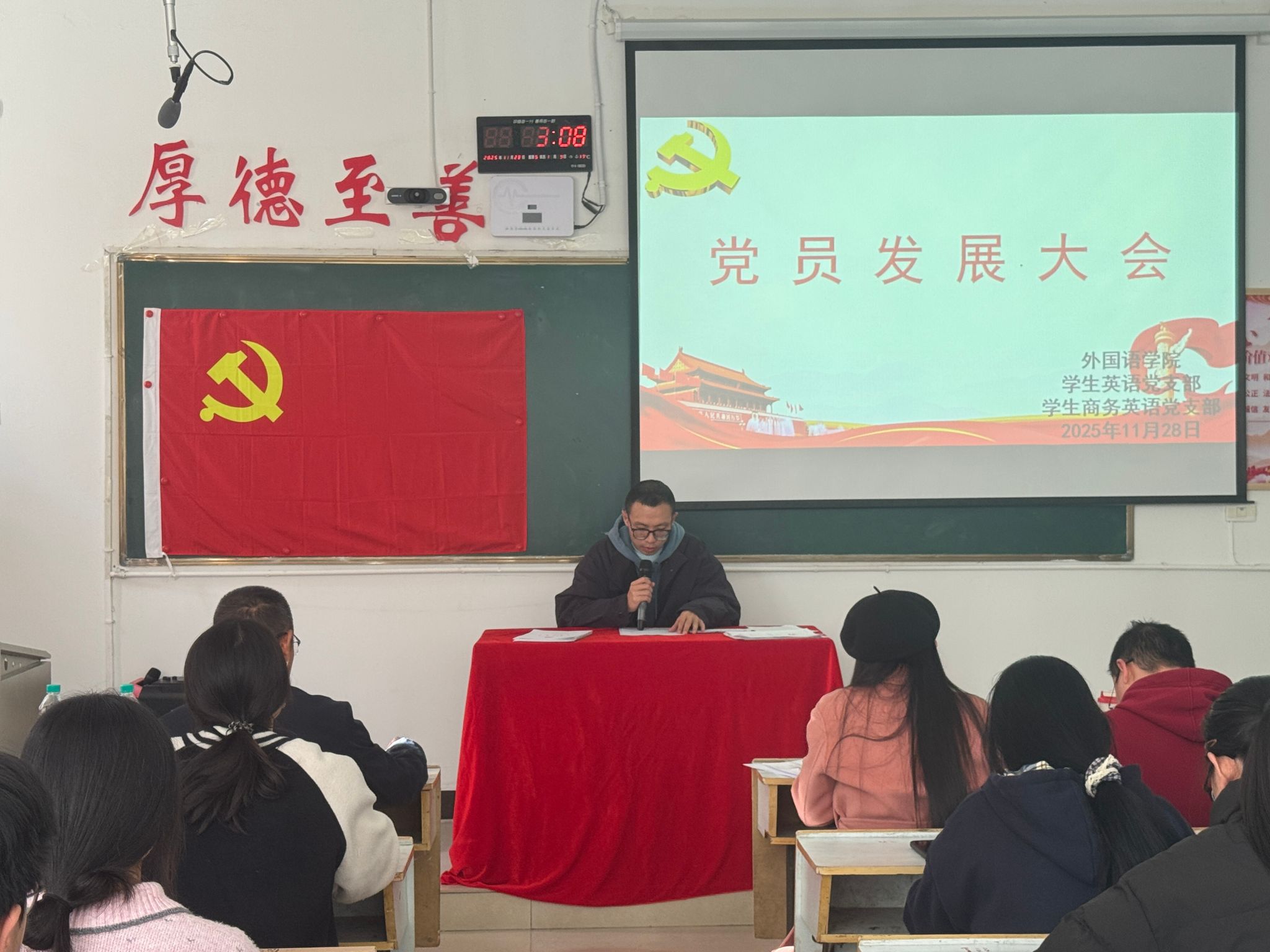 为确保党员发展质量,增强党组织凝聚力,2025年11月28日下午2时整,外国语学院学生商务英语党支部于英华楼3304教室召开党员发展大会,讨论洪凯霞、陈聪等5名发展对象的入党问题。参加此次大会的有外国语学院党委书记刘佳萍,外国语学院学生英语支部书记钟倩、外国语学院学生商务英语支部书记何宇以及支部全体党员。大会由外国语学院学生商务英语党支部书记何宇主持。